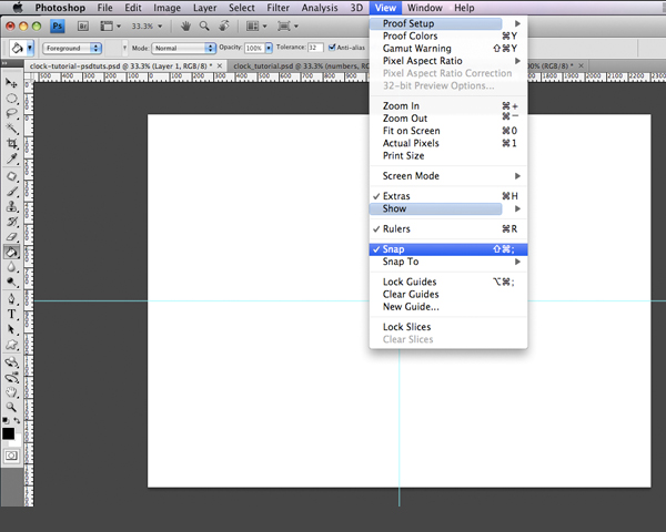 Next we'll set some guides. Be sure your snap feature is turned on View > Snap (Command + Shift + Colon key). Unfortunately there is no visual aid to show that it is turned on. Press Command + R to display your rulers, then use the Selection Tool (V) to drag a guide from the left and top rulers, ensuring they snap to the center of the artboard. Press Command + Colon key to hide any Guides at any time.