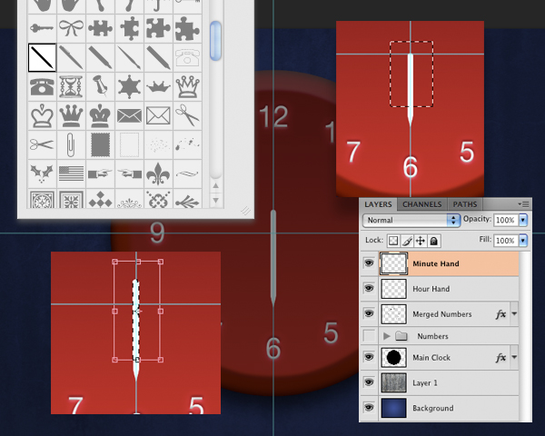 Create a new layer and name this "Hour Hand." Use your Custom Shape Tool (U) and choose the pencil shape from the drop down menu at the top. This looks most like a clock dial. Drag out a shape to make it look like a short, thin hour hand. Press Command + T, then hold Shift while rotating the hand so it is straight up and down. Position it towards the center to help you measure the next hand.