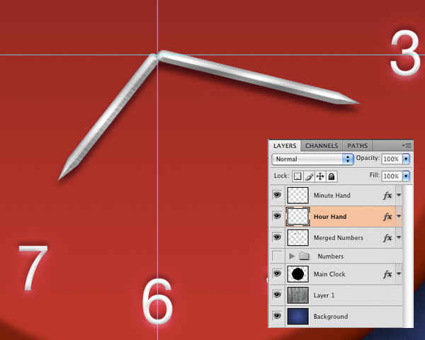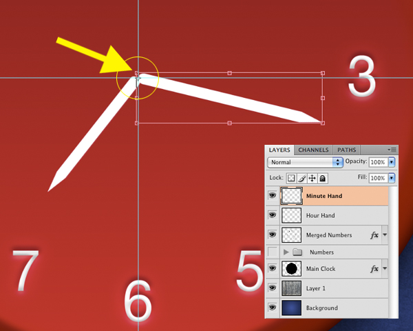 Hold the hands together by creating a center piece. Create a new layer and name it "Center." Command-click on the "Main Clock" layer thumbnail to create a marquee. Fill it with any color (Command + Delete), Deselect the marquee (Command + D), resize to the center (Command + T). Don't forget to hold Shift + Option to constrain the proportions to the center.