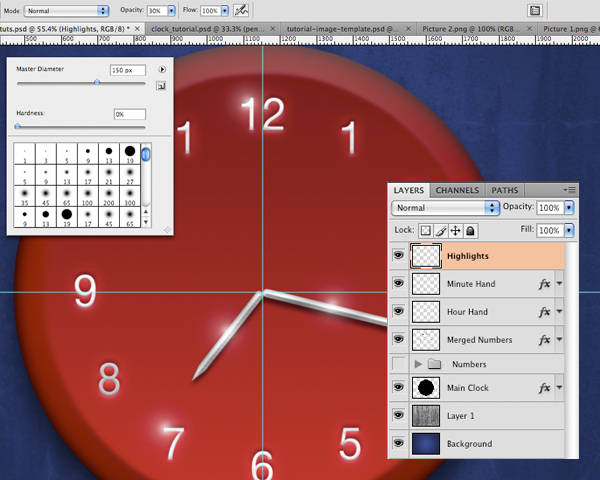 Adding some light spots to the clock hands will make our effect even more realistic. Create a new layer and name it "Highlights." Press (D) for your default colors, then (X) to switch to white.