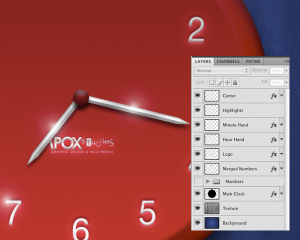 - Drop Shadow: Opacity = 55, Distance = 11 (14 for the "Minute Hand"), Size = 13.