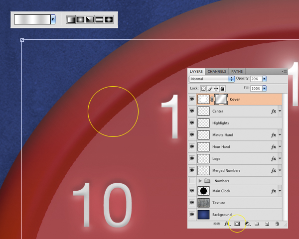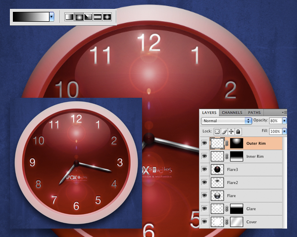 Select your Gradient Tool (G), and choose Radial Gradient. If the layer mask is selected, press (D) for your default colors. Shift-drag up from the top of the "Outer Rim." You will have to drag about 3-4 inches above the clock. Zoom out if necessary. This will give us a nice hot spot on the top of the clock, which is closer to the light source.