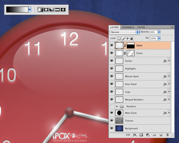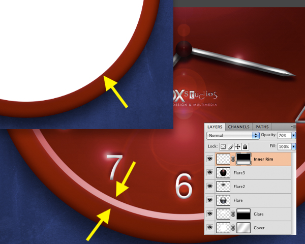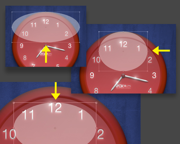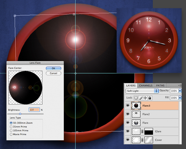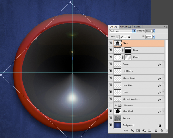 Transform the "Glare" layer by pressing Command + T, then Shift-dragging from the bottom and bring it above the center line. Shift + Option-drag from the right side to squeeze the layer, then Shift-drag from the top to squeeze it down into place. Use the image below for reference. Make sure the glare is covering the number 12, as shown.