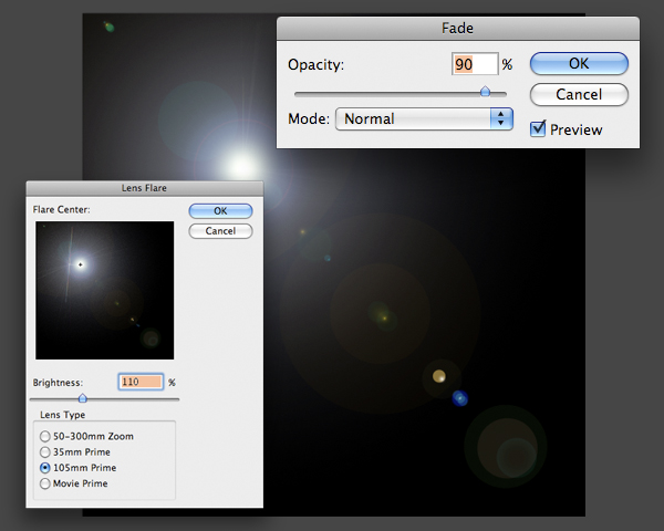 Go to Filter > Render > Lens Flare. This time choose 50-300mm Zoom, and position the flare crosshair on the left side so all of the reflections are aligned from left to right. Select 110%. Press OK.