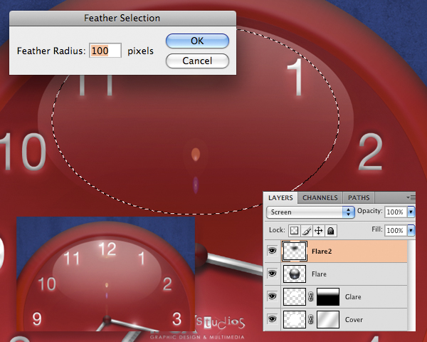 We need to add more pop to the glare at the top. Command-click on the "Glare" layer thumbnail to create a marquee. Select the "Flare" layer, then press Shift + F6 to bring up the Feather Selection dialog box. Type 100 pixels and click OK. This will fade our flare and blend it more.