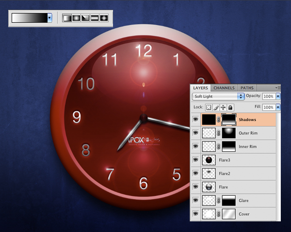 Create a new layer and name it "Shadows." Fill it with black. Set the layer mode to Soft Light (V, then Shift and use the Plus or Minus keys). Now create a Layer Mask, choose your default colors (D), select your Gradient Tool (G), then Shift-drag a Linear Gradient from the bottom of the image to the center of the clock. This will add a little more depth to our image by fading the light.