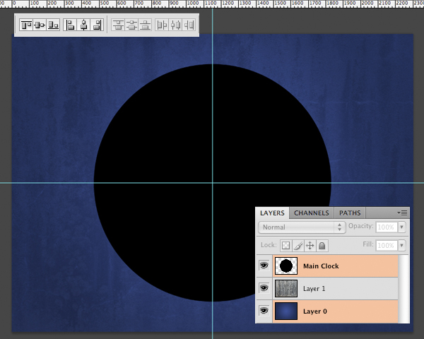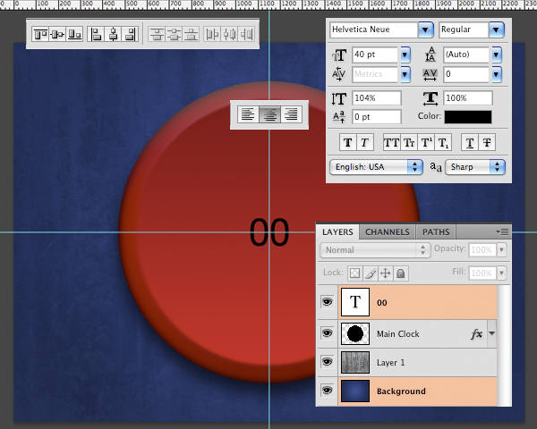 Select the Main Clock Layer and the "Background" Layer by Command-clicking each layer (if a marquee appears, that means you clicked on the layers thumbnail. Oops!) Press (V) for your Selection Tool, then align the circle by pressing the Align Vertical Centers, and the Align Horizontal Centers. This is a precautionary measure to make sure everything lines up later down the road.