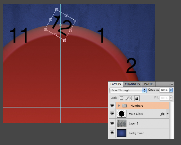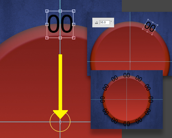 Note: Using the bounding box to rotate the numbers into place is the quickest way, but you have other options as well. Try rotating it 30 degrees, then click the check box to accept the changes. Now press Command + Shift + T to repeat the transform. Keep doing this until the number is in place. Now you can select a different number layer and use the same keyboard shortcut. Neat!